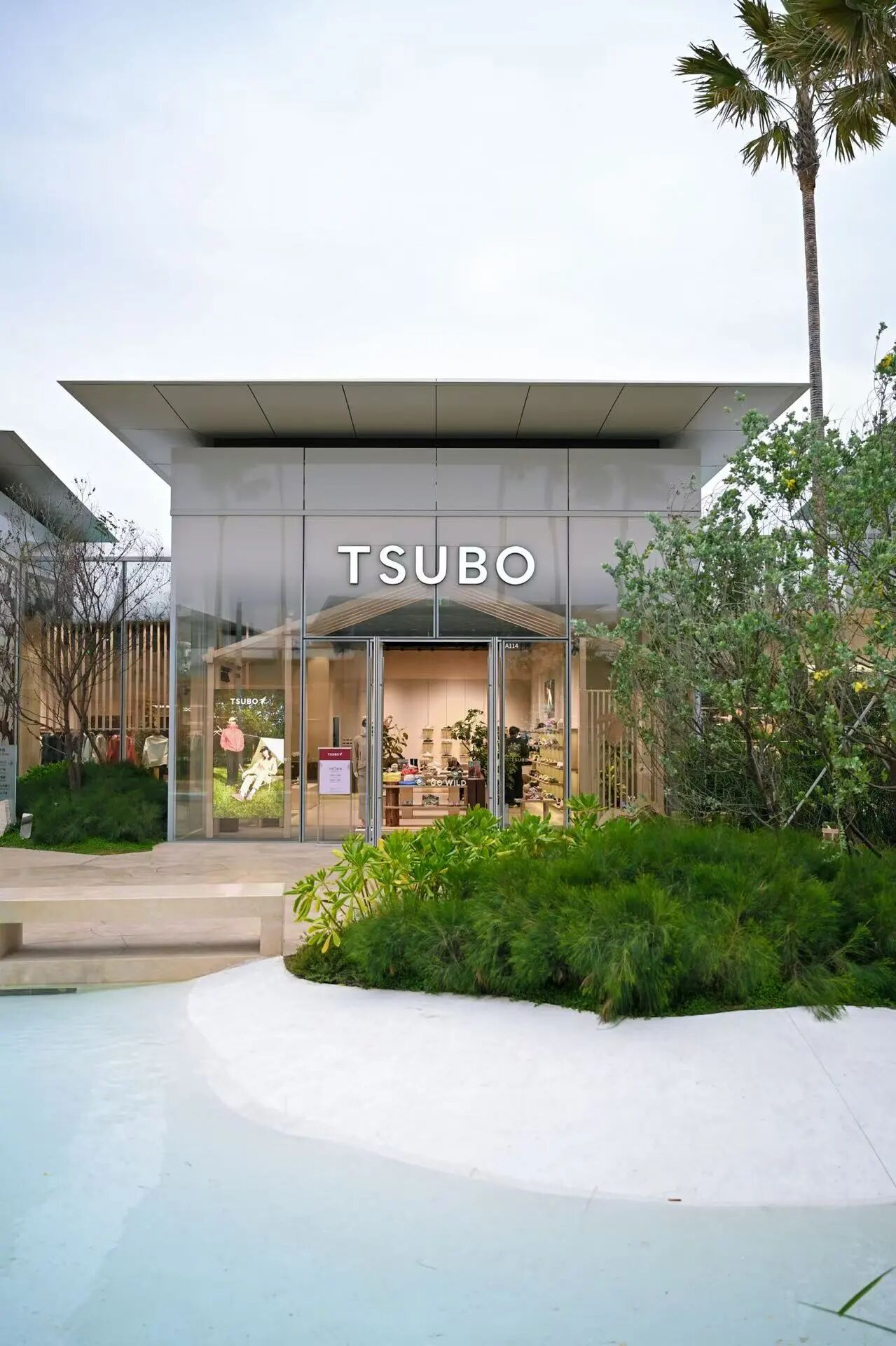 TSUBO全国奥莱首店采用单层独栋盒子式建筑,搭配大挑檐平顶设计,线条极简利落,在开放式奥莱街区中形成独立的高端旗舰感。