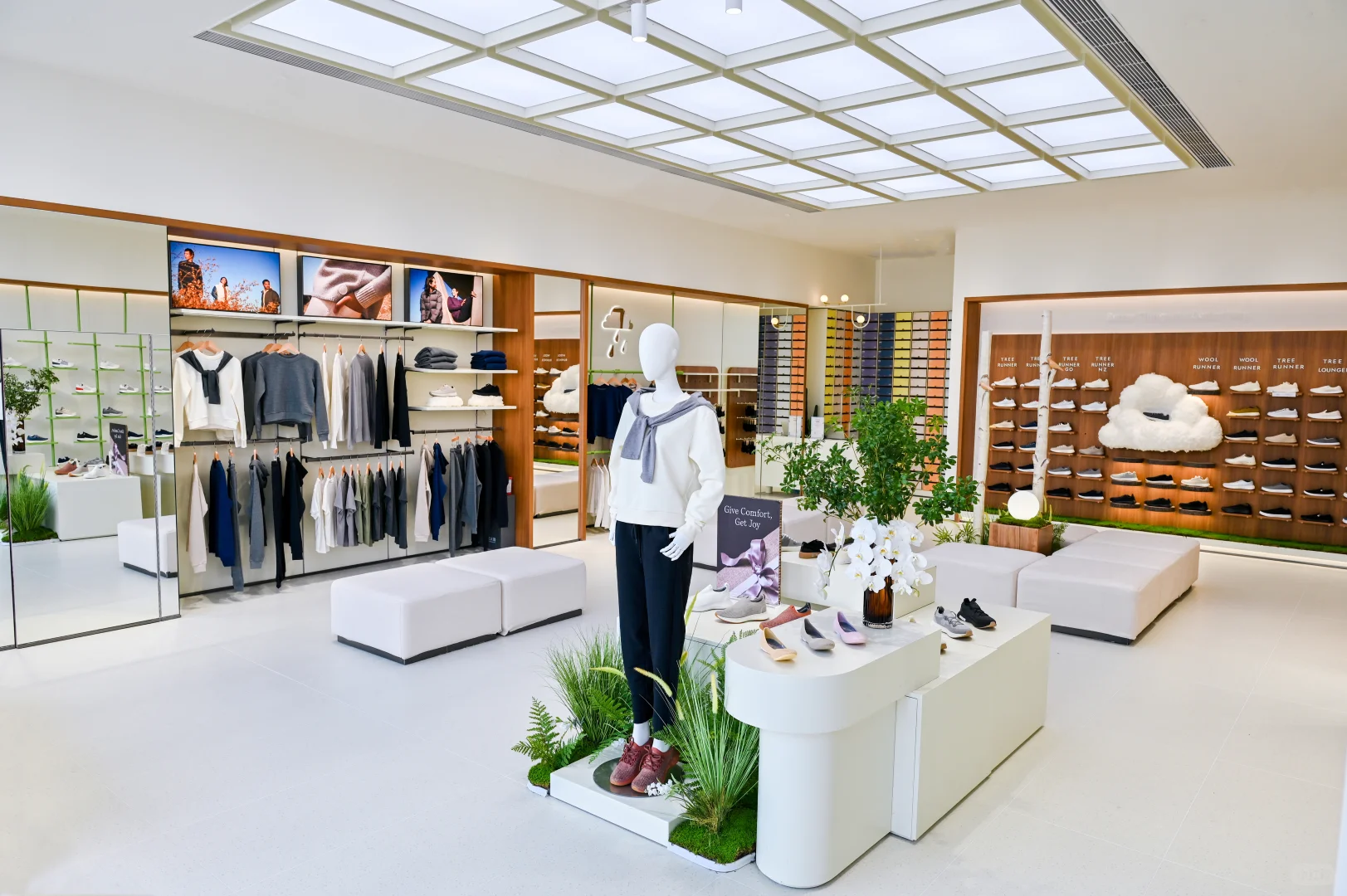 陈列兼顾美学与实用。服装陈列在清新柳绿的衣架分层挂放,低饱和色系规整分类;鞋类按色系陈列于树皮展架,搭配“GiveComfort,GetJoy”展示台,既突出舒适卖点。